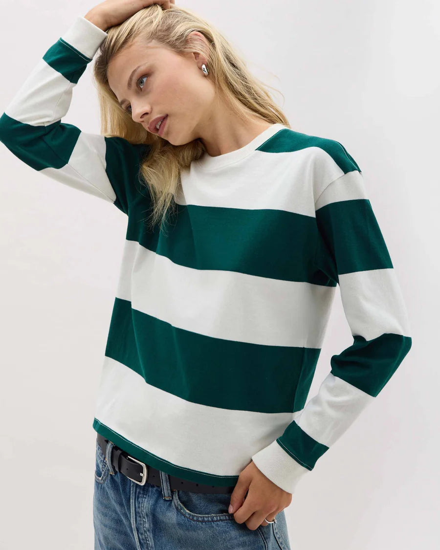 The Richer Poorer Varsity cozy long sleeve is your new go-to for laid-back style. Crafted from vintage-inspired, beefy 20/2 Pima Cotton Jersey, it offers a relaxed fit that’s easy and loose around your body. With yarn-dyed rugby stripes and ribbing at the neck and cuffs, it’s the perfect mix of classic and comfy—right in between a tee and a fleece. Perfect for days when you want to chill without giving up style.