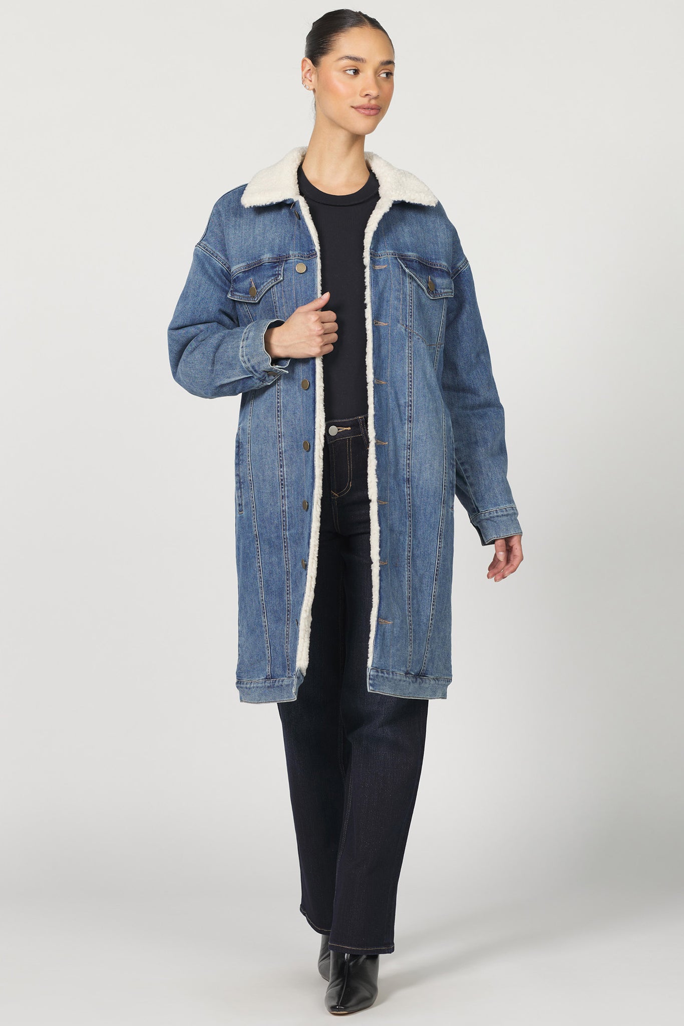 Person wearing a long denim coat on a white background