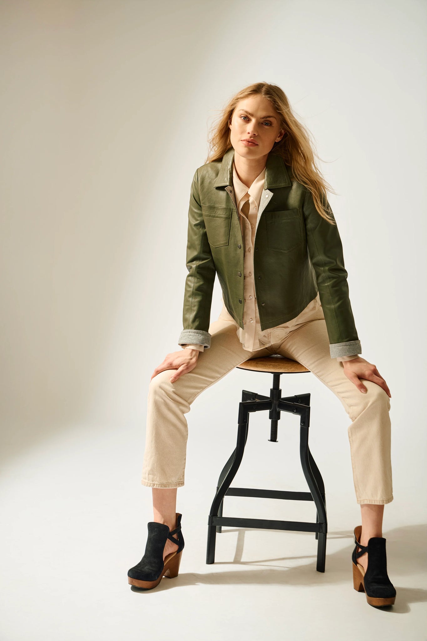 The Lefei Jacket blends style and comfort, making it the ultimate wardrobe staple. This cropped, collared shirt jacket is crafted with light leather bonded to a poly-cotton blend fabric, offering a unique and fashionable edge.